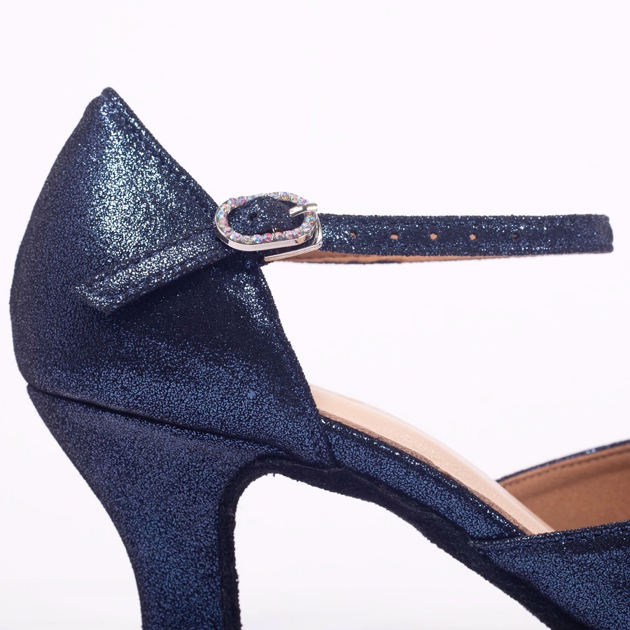 Embrace your first steps with the lowest-heels (2 inch) model in our collection.. This model features a shimmering metallic blue finish that is anything but boring, paired with a butterfly-style front specifically designed for maximum comfort. The supportive low heels ensure a stable, graceful journey as you begin your tango story.